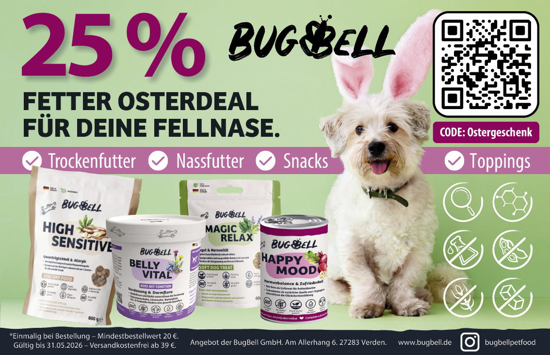 25% RABATT | FETTER OSTERDEAL FÜR DEINE FELLNASE. BugBell GmbH Startdatum 20.03.2026 Ablaufdatum 31.05.2026 Code Ostergeschenk Couponcode kopieren Coupon einlösen Coupon drucken! Endet in