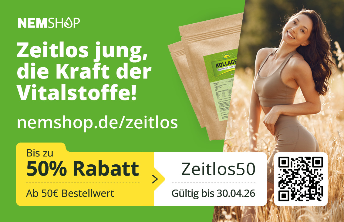 Bis zu 50% Rabatt | Zeitlos jung, die Kraft der Vitalstoffe! NEMSHOP.DE Startdatum 20.03.2026 Ablaufdatum 30.04.2026 Code Zeitlos50 Couponcode kopieren Coupon einlösen Coupon drucken! Endet in