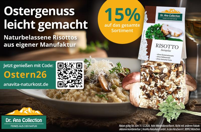 15% auf das gesamte Sortiment | Ostergenuss leicht gemacht! Naturbelassene Risottos aus eigener Manufaktur Mehr Details Endet in