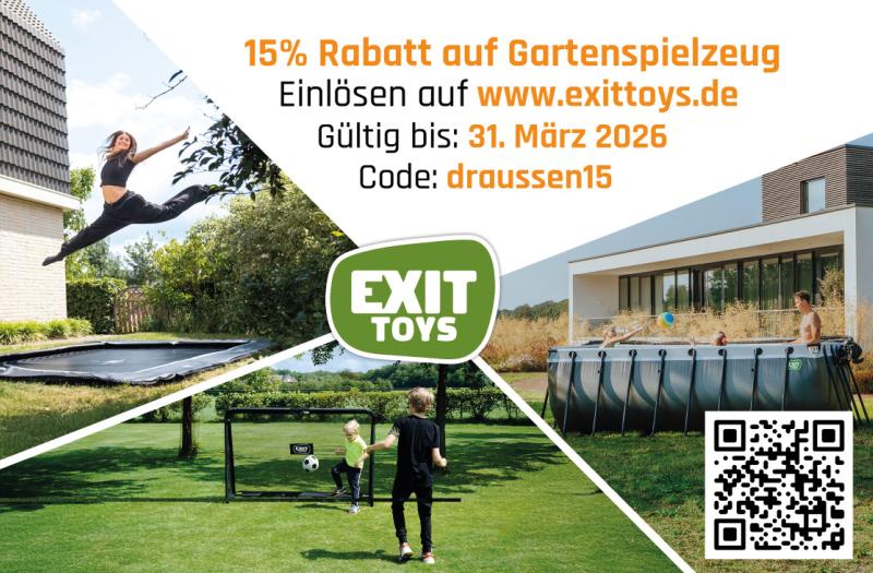 • 15% Rabatt auf Gartenspielzeug Einlösen auf www.exittoys.de