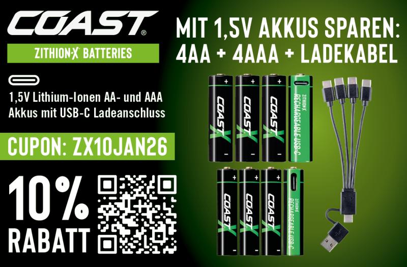 • 10% RABATT | COAST. ZITHION-X BATTERIES MIT 1,5V AKKUS SPAREN: 4AA + 4AAA + LADEKABEL