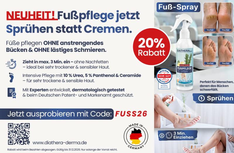 • 20% Rabatt | NEUHEIT! Fußpflege jetzt Sprühen statt Cremen. Füße pflegen OHNE anstrengendes Bücken & OHNE lästiges Schmieren.